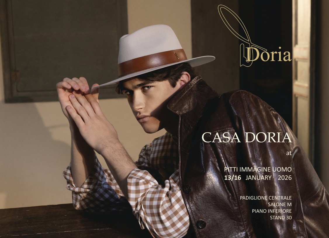 Doria 1905 si racconta attraverso il suo DNA, le sue origini ed il suo intramontabile lusso accessibile. La collezione valorizza elementi estetici classici richiamando uno stile retrò e introduce un nuovo blend di feltro che unisce fibre di lana e lapin con una finitura speciale, dalla mano leggermente smerigliata, proposta in un profondo colore Denim. Una tonalità che richiama il blu del cielo quando incontra la linea di orizzonte sul mare in tempesta. Illuminati dalla cinta in gros grain di velluto i classici di Casa Doria si trasformano in complementi unici. La collezione esprime un forte legame iconografico con il territorio, ne racconta i colori e le tradizioni in un classico contemporaneo. Una celebrazione del “Fatto a mano” perseguita con costanza e passione, una valorizzazione continua delle tecniche artigianali radicate nel territorio con l’obiettivo di preservare e custodire l’autenticità del brand. Un innato stile western che racconta la natura selvaggia e sfrontata del Salento attraverso uno stile pulito e raffinato, in cui le forme più classiche dello stile italiano dialogano con accenti rider o con un totale destrutturato, da formare e stropicciare a piacere.